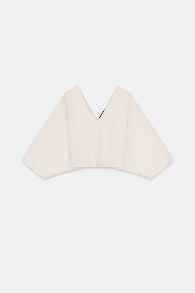 Zara propone una blusa de escote en pico tanto en delantero como en espalda, que aporta un aire contemporáneo y elegante. Las mangas, que llegan por debajo del codo con la sisa amplia, combinan comodidad y estilo, mientras que el tejido doble aporta textura y sofisticación al conjunto. Una opción perfecta para quienes buscan un look de invitada moderno, fresco y con un toque de originalidad esta primavera.