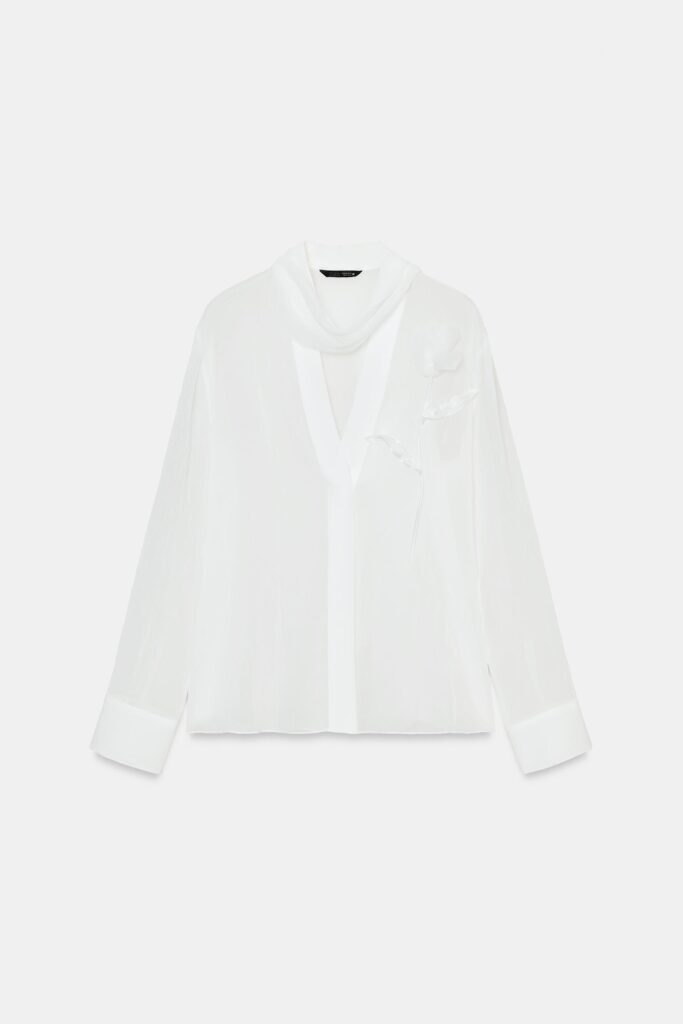 Zara propone una blusa que combina delicadeza y modernidad, confeccionada en tejido semitransparente con efecto arrugado que aporta ligereza al look. Su escote en pico y las mangas largas equilibran la feminidad con un toque de sofisticación, mientras que el detalle frontal en forma de flor añade un guiño romántico que marca la diferencia. Perfecta para combinar con pantalones acampanados, esta pieza se luce aún más en colores llamativos, convirtiéndose en una opción versátil y contemporánea para las invitadas que buscan destacar con elegancia esta primavera.