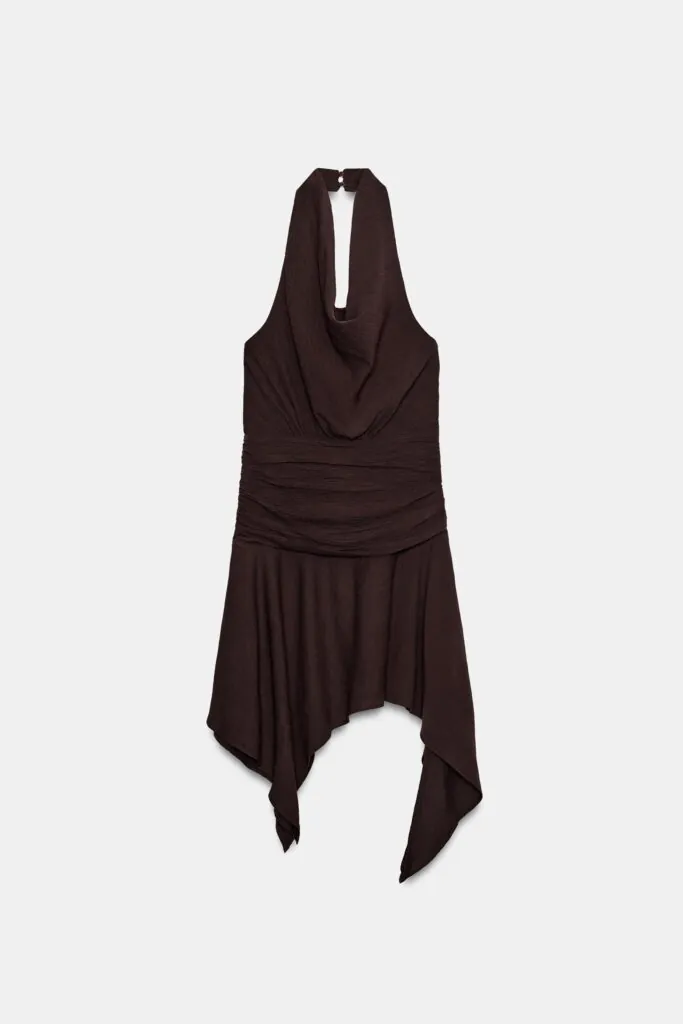 Un vestido fluido de cuello halter y espalda descubierta, con frunces en la cintura, bajo asimétrico y cierre lateral con cremallera oculta, en un intenso marrón chocolate, destaca por su corte atrevido y tejido elegante. Combinado con accesorios en tonos contrastantes como el naranja, aporta un toque moderno y actual, mientras que un peinado recogido potencia el escote, completando un look sofisticado y contemporáneo perfecto para bodas de primavera.