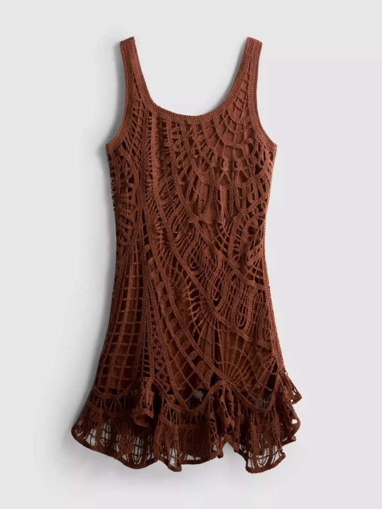 Un vestido corto de punto de crochet en color marrón, con escote redondo y bajo con volantes, se posiciona como la elección perfecta para las bodas de primavera. Combinado con sandalias de tiras altas y tacón fino en dorado, y una pamela XXL, se consigue un look sofisticado y chic, que mezcla elegancia con el aire relajado y fresco de la temporada.