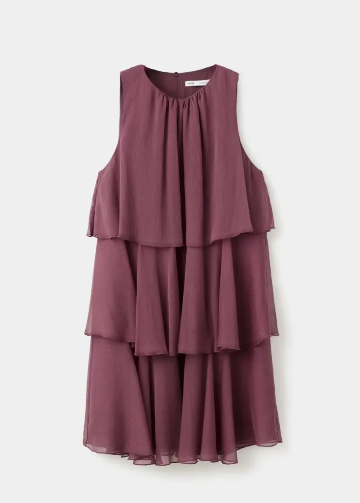 Un diseño corto en color berenjena, con detalle de volante y tirante ancho, se convierte en una opción versátil para las bodas de primavera. Ideal para combinar con accesorios plateados o dorados, según lo que más favorezca, logra un equilibrio entre sofisticación y modernidad, aportando un toque de elegancia que no pasa desapercibido.