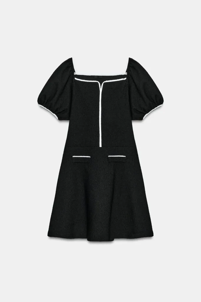 El vestido corto de escote recto y manga corta abullonada se posiciona como una opción pulida y contemporánea para invitadas que buscan elegancia sin excesos. Los falsos bolsillos de vivo en el delantero y los detalles a contraste elevan el diseño, aportando estructura y un sutil aire sofisticado. En negro, funciona como un lienzo perfecto para jugar con tocados en otros tonos, creando un contraste estudiado y lleno de intención. Una elección que demuestra que el minimalismo, bien ejecutado, puede ser el mayor gesto de estilo.