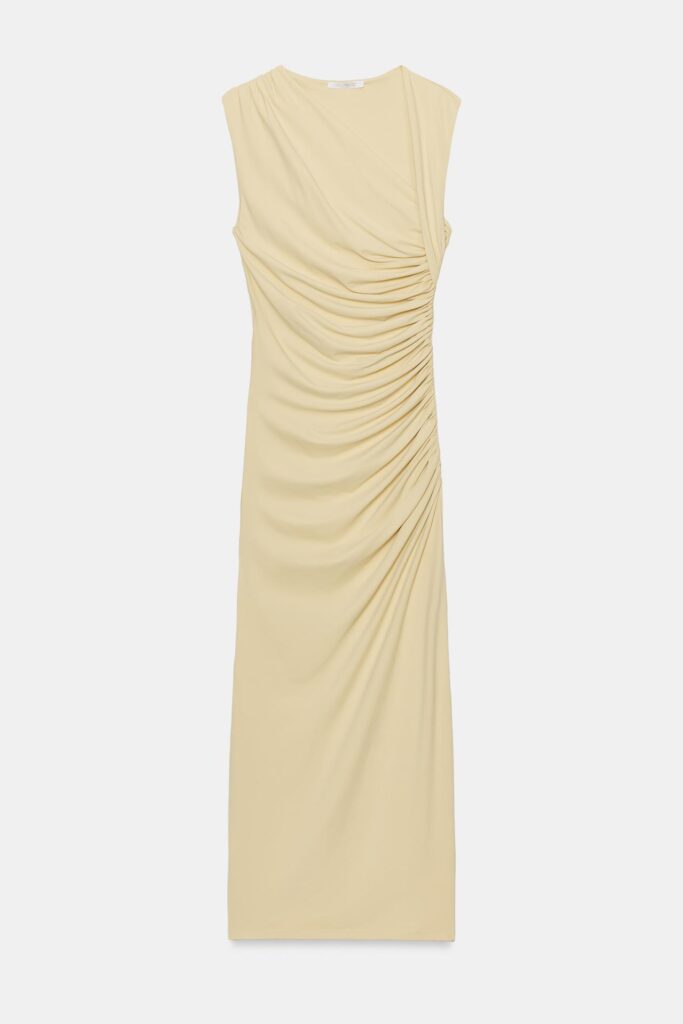 Vestido midi de Zara en color mantequilla, confeccionado en mezcla de poliamida, con un acabado ligero y actual. Presenta escote asimétrico, manga sisa y drapeado en el delantero que aporta movimiento y un efecto favorecedor en la silueta, rematado con bajo recto para un resultado limpio y sofisticado.