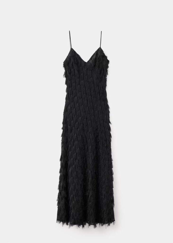 Diseño de Mango largo de silueta recta con escote en pico, tirantes finos y espalda abierta que aporta un aire elegante y actual. Los detalles deshilachados introducen un acabado más desenfadado y contemporáneo, muy en línea con las tendencias de invitada relajada que se ven esta temporada.