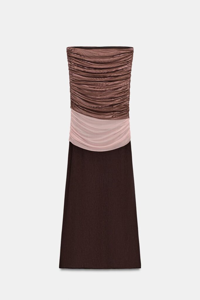 Vestido midi palabra de honor de Zara en mezcla de viscosa, con caída fluida y aire sofisticado. El diseño incorpora combinación de tejidos en contraste y drapeado lateral que estiliza la silueta, con bajo recto para un acabado limpio.