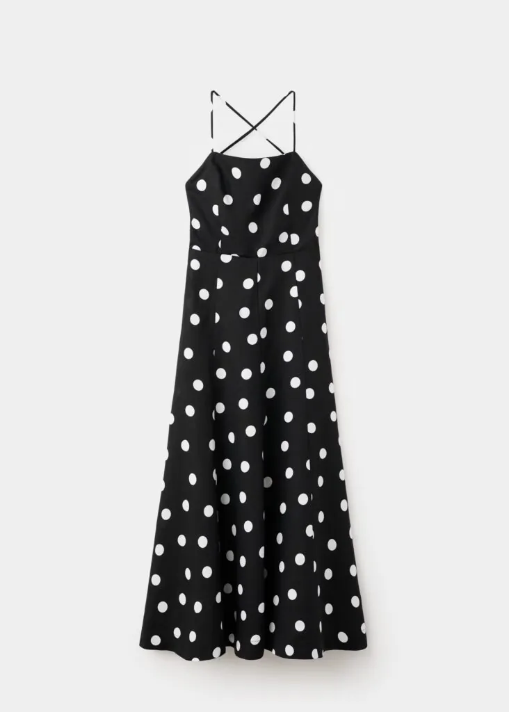 Vestido largo de silueta evasé en mezcla de lino y lyocell, con estampado de lunares. Presenta cuello halter, diseño sin mangas y cierre de lazo en la espalda, junto a cremallera trasera y forro interior. Una propuesta de aire sofisticado pensada para looks de fiesta y ocasión especial.