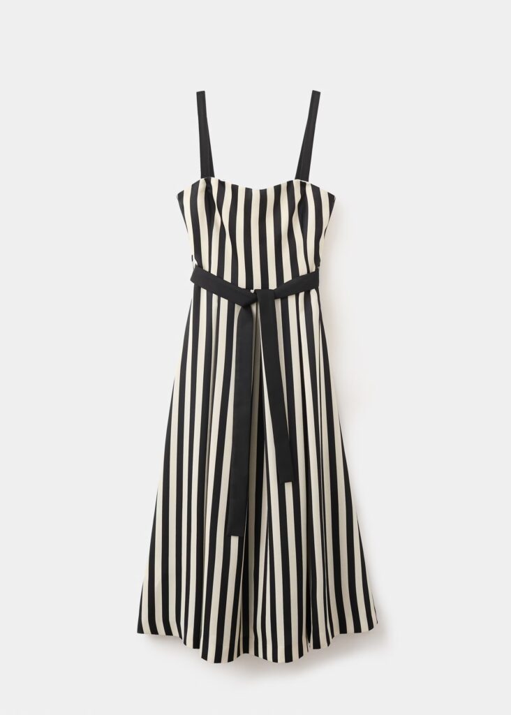 Vestido midi evasé con estampado de rayas, de aire ligero y actual. Presenta cuello redondo, tirantes finos y detalle de cinturón que define la cintura. El cierre de cremallera trasero aporta un acabado limpio. Una propuesta de la colección de fiesta pensada para elevar looks en ocasiones especiales.