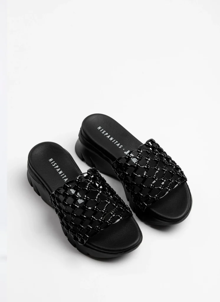 Las sandalias de Hispanitas x Juan Vidal presentan un diseño de tiras trenzadas con una plataforma de 5,5 cm en color negro, ideal para conseguir looks más modernos y aportar un toque chic y sofisticado.