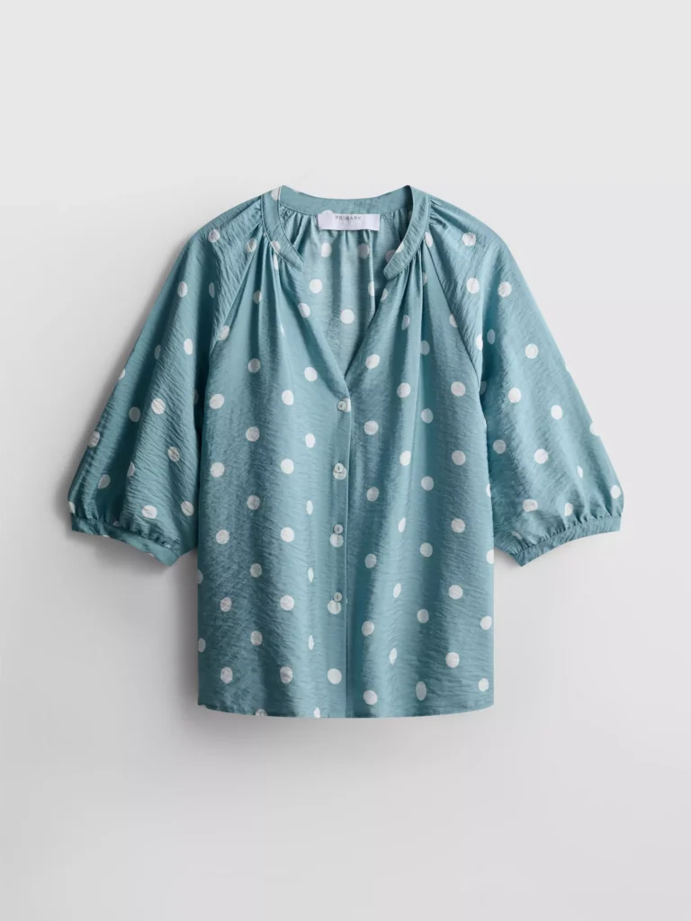 Blusa vaporosa con cuello de pico y manga 3/4, ligera y fluida en su caída. Los botones en azul cielo y los lunares blancos aportan un aire fresco y muy actual.