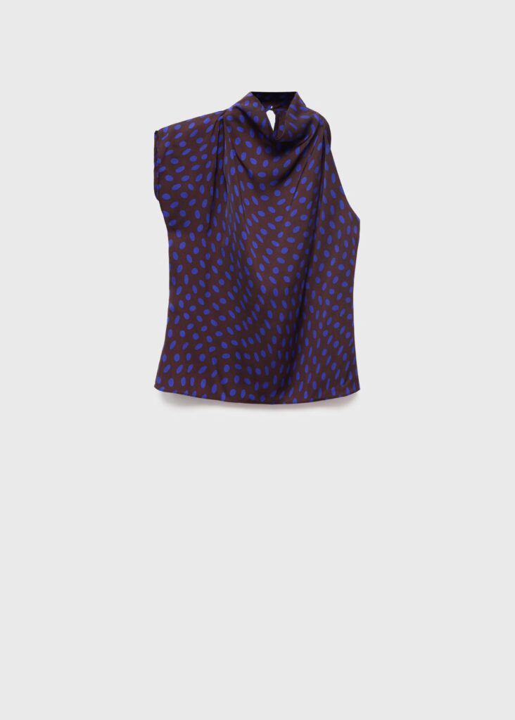 Blusa asimétrica en marrón chocolate con cuello drapeado, que aporta un efecto elegante y envolvente. El estampado de lunares en azul eléctrico introduce un contraste vibrante, convirtiéndola en una opción ideal para looks de evento con carácter contemporáneo.
