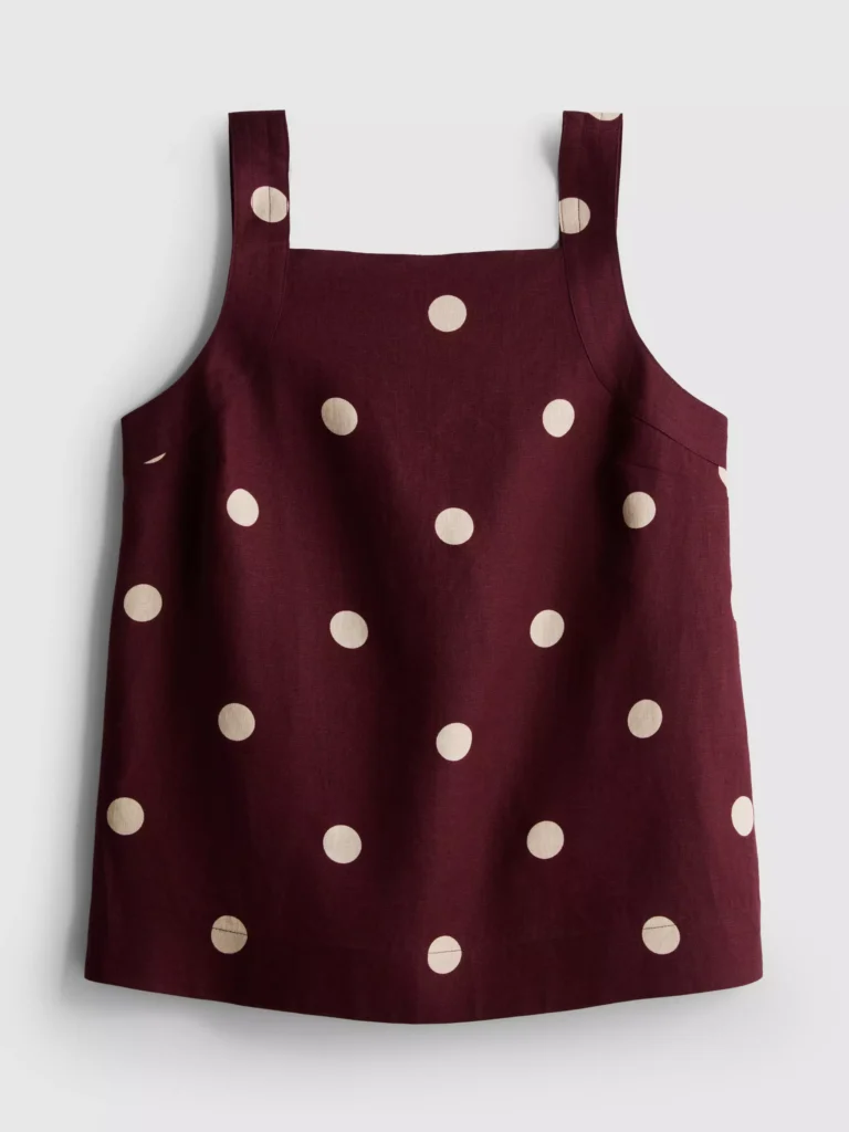 Camisa de tirantes de lino evasé, con tirantes anchos y escote cuadrado, que apuesta por una silueta relajada. Las costuras vistas en granate y los lunares blancos aportan contraste y un guiño de tendencia.