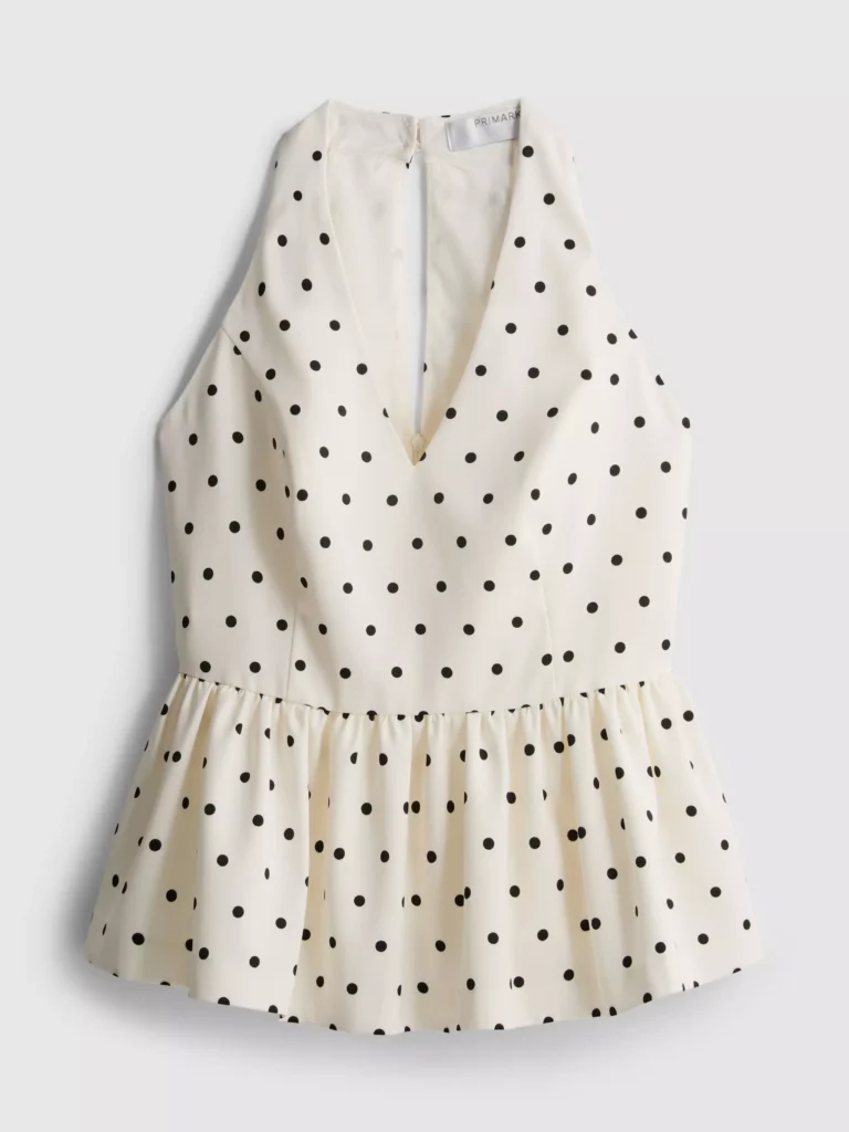 Blusa con escote con escote halter y péplum, que marca la cintura y aporta volumen en clave femenina. El escote en pico y el estampado de lunares en blanco con puntos negros refuerzan un aire gráfico y muy actual.