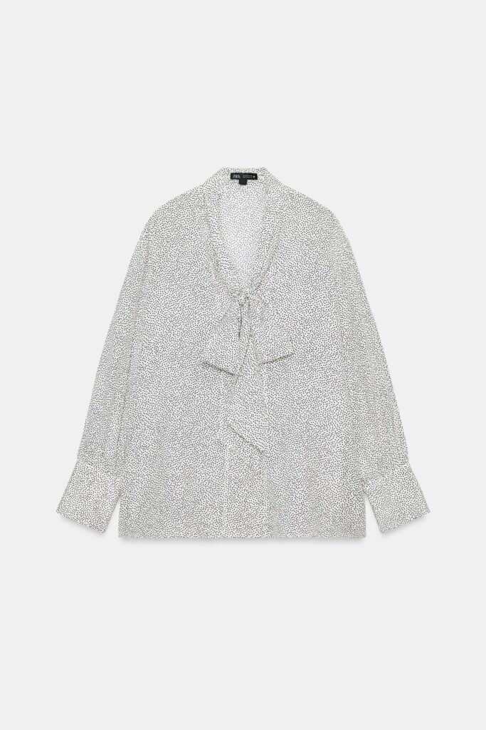 Blusa de cuello subido con lazo en la espalda y manga larga con acabado elástico, que aporta un aire sofisticado. El forro interior y el estampado de lunares refuerzan una propuesta elegante y muy actual.