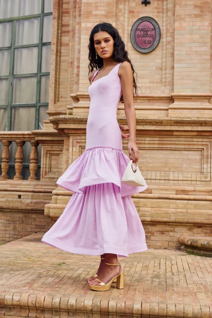 Este vestido destaca por su doble volante fruncido de caída amplia, un recurso que aporta volumen y un movimiento muy reconocible a la prenda. El diseño se completa con escote cuadrado y tirantes gruesos, mientras la silueta entallada hasta la cadera refuerza una estética femenina, cuidada y estructurada. Una propuesta especialmente acertada para eventos primaverales que, en plena temporada de Feria de Sevilla, encaja también con una lectura de inspiración sevillana, perfecta para estilismos que buscan equilibrio entre tradición y tendencia.