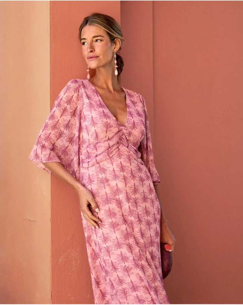 Vestido midi en tonos rosa y fucsia con estampado, confeccionado en un tejido ligero y fluido que aporta movimiento y frescura. Presenta escote en pico y manga tres cuartos amplia, mientras el fruncido en la cintura define la silueta y potencia el efecto favorecedor. Una propuesta de invitada pensada para eventos y celebraciones especiales, con un equilibrio entre color, dinamismo y elegancia relajada.