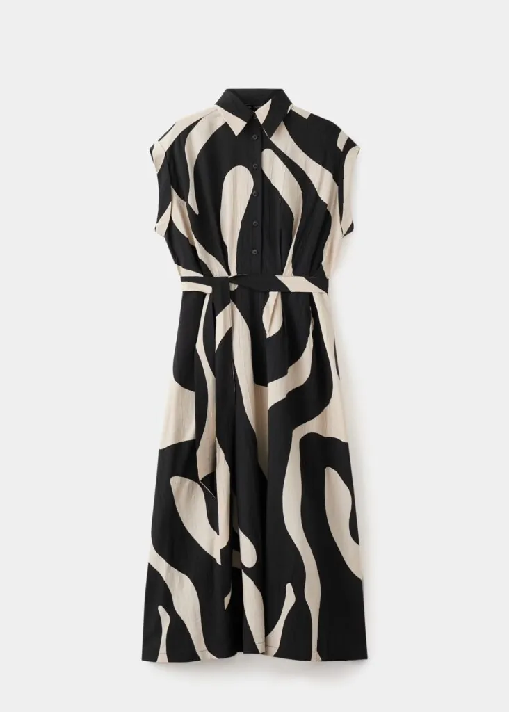 Confeccionado en tejido de efecto arrugado, este vestido de silueta evasé y largo fluido se presenta como una opción ligera y sofisticada para la temporada. El cuello camisero y el cierre frontal con botones refuerzan su aire clásico, mientras que el diseño sin mangas aporta frescura. El cinturón ajustable permite definir la silueta, elevando una prenda pensada para un estilo relajado pero cuidado, ideal para los días de calor y los planes de verano.