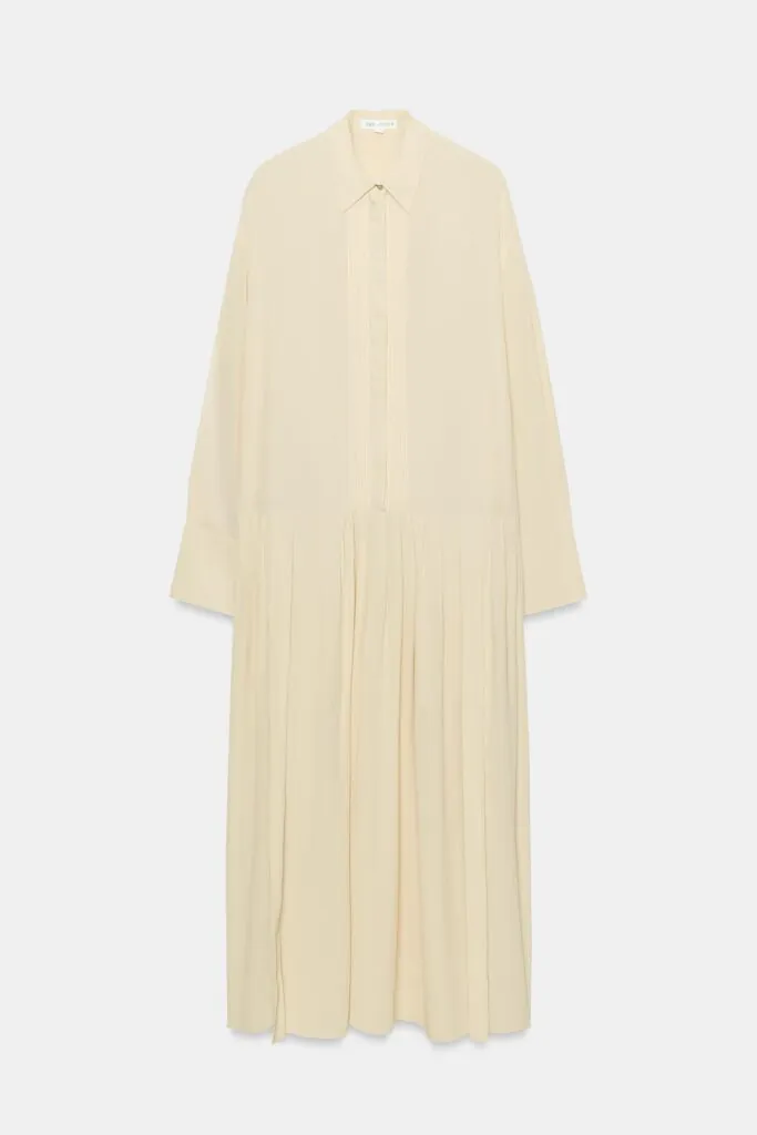 Vestido confeccionado en hilatura de viscosa, con cuello solapa y manga larga rematada en puño, que apuesta por una silueta cuidada y femenina. El plisado delantero y los frunces en la cintura aportan textura y definición al diseño. Ideal para complementar con un cinturón ancho en tono marrón, un detalle clave que realza la figura y aporta equilibrio, elevando la prenda hacia un look más estructurado y con mayor juego estilístico.