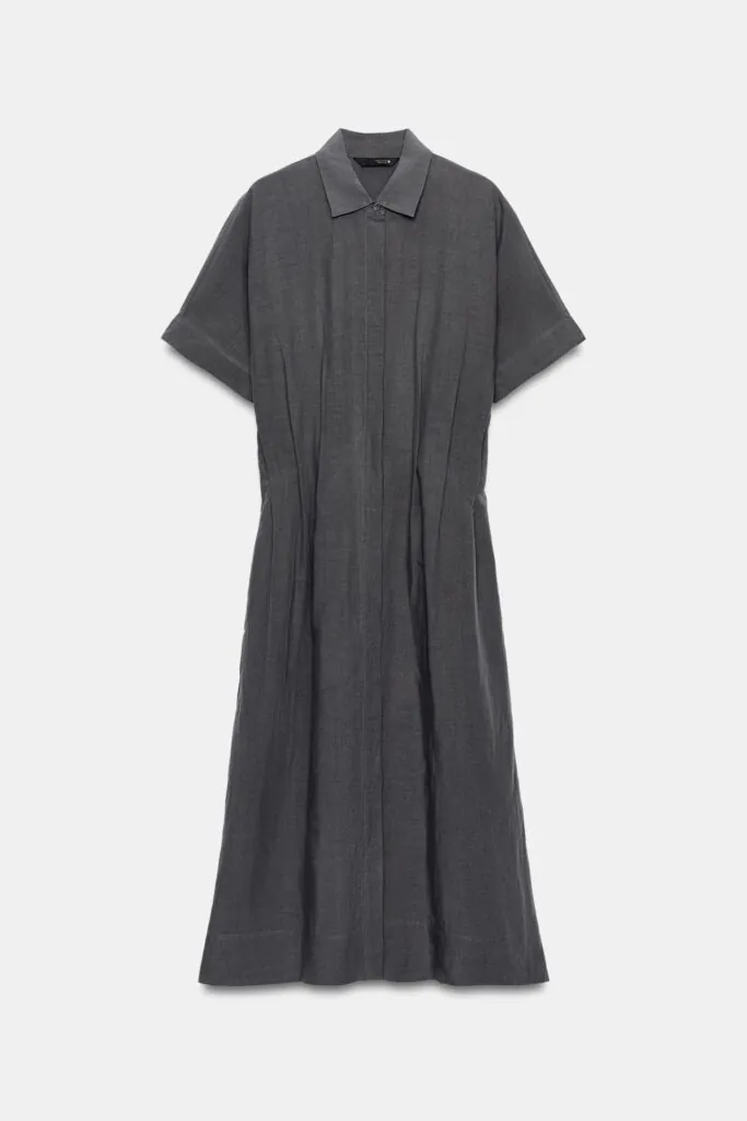 Vestido midi confeccionado en hilatura con mezcla de lyocell y lino, que aporta ligereza y un acabado natural muy en tendencia. Presenta cuello con solapa y manga corta, además de un detalle de pliegues en la cintura que estructura la silueta con sutileza. El bajo recto remata un diseño limpio y versátil, pensado para elevarse fácilmente con accesorios que aporten carácter y personalidad al conjunto, reforzando un estilo cuidado y con esencia propia.