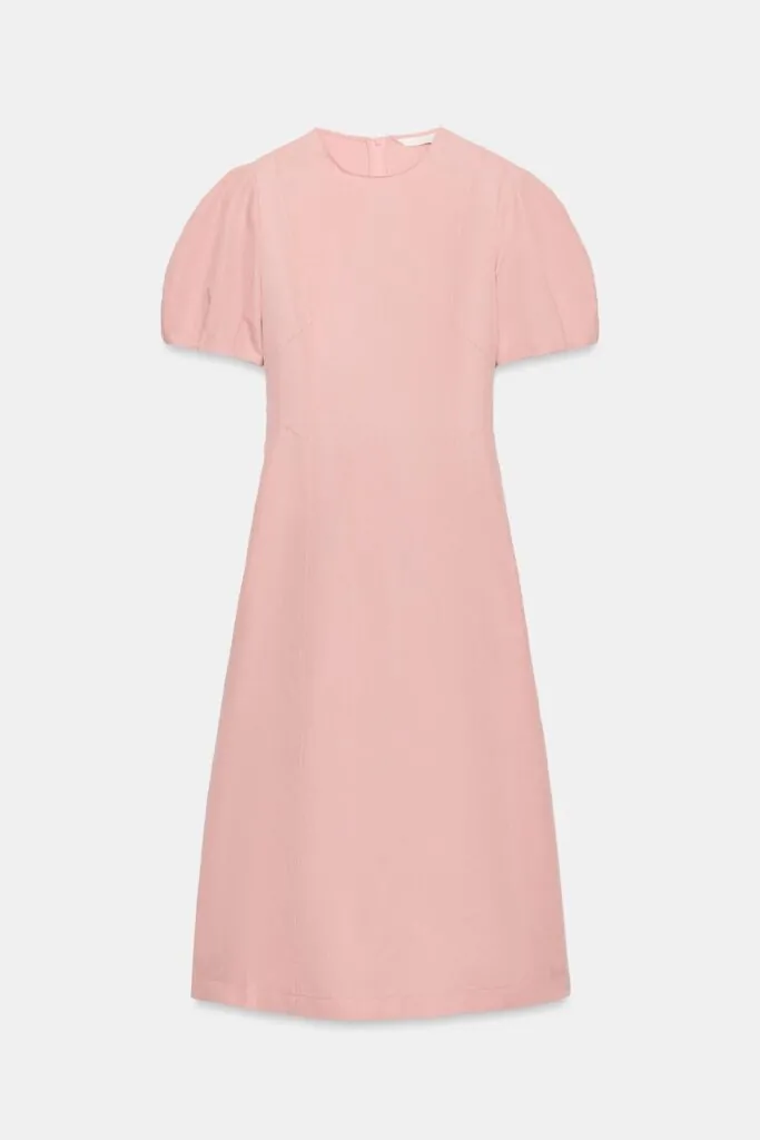 El vestido, de largo midi, está confeccionado en una hilatura con un 32% de lino, una mezcla que aporta frescura y una caída natural. El diseño apuesta por un cuello redondo y manga corta abullonada, rematada con elástico, un detalle que añade volumen controlado y un aire delicadamente femenino. El bajo, terminado en línea evasé, refuerza el movimiento de la prenda, mientras que el cierre trasero con cremallera oculta en costura mantiene una estética limpia y depurada.