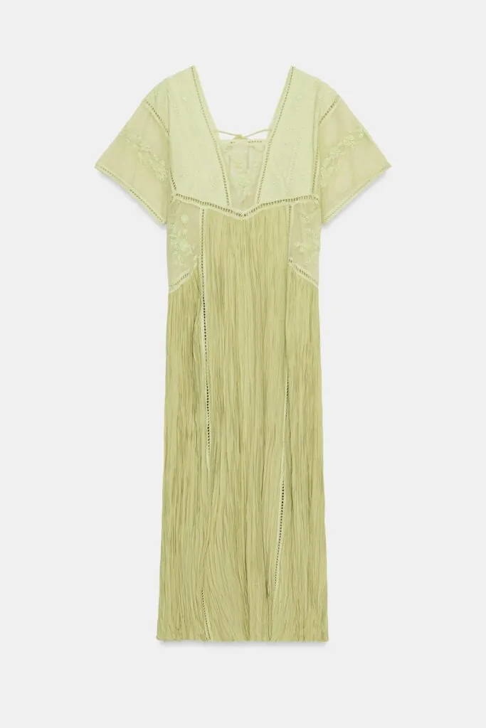 El vestido, confeccionado en una hilatura que combina viscosa, se presenta con un escote cuadrado y manga corta que refuerzan su silueta depurada. El diseño incorpora bordados a tono que aportan textura sin romper la armonía cromática, mientras que el bajo, realizado en tejido satinado plisado, introduce un contraste sutil de brillo y movimiento que eleva el conjunto con un acabado más sofisticado.