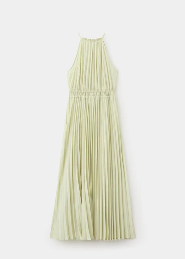 La pieza, confeccionada en tejido plisado, se presenta en un largo midi con silueta evasé que aporta movimiento y fluidez en cada paso. El cuello halter, acompañado de tirantes finos, enmarca la parte superior con delicadeza, mientras que el cierre en el cuello refuerza la estructura del diseño. Sin mangas, la propuesta se inclina hacia una estética ligera y sofisticada, donde la textura plisada se convierte en protagonista absoluto.