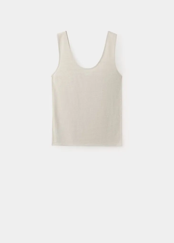 Confeccionada en tejido 100% lino, esta prenda apuesta por un diseño recto de líneas depuradas, con cuello y escote redondos y acabado sin mangas, en un tono blanco roto que refuerza su estética atemporal. Se trata de ese básico imprescindible que ocupa un lugar fijo en cualquier armario femenino, una pieza que funciona como recurso infalible cuando el estilismo pide sencillez bien resuelta y que, temporada tras temporada, se mantiene como comodín para salir de cualquier apuro con naturalidad y elegancia.