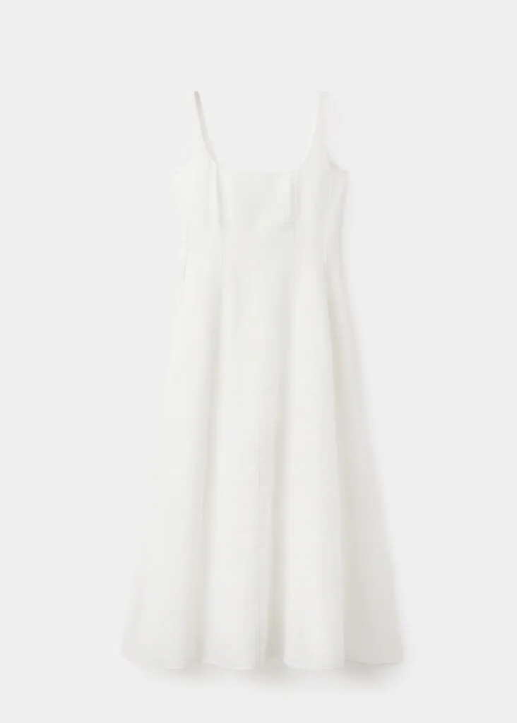 Mango apuesta por un vestido confeccionado en tejido 100% lino, con silueta evasé y largo midi, un diseño de escote recto y sin mangas en color blanco, que se equilibra con tirantes anchos y forro interior. Una propuesta que se sitúa en esa línea de prendas todoterreno del verano, capaz de adaptarse a diferentes escenarios si se acompaña de los complementos adecuados, desde un look más relajado de día hasta una opción más cuidada para planes de tarde o noche, dependiendo siempre de cómo se eleve el estilismo.