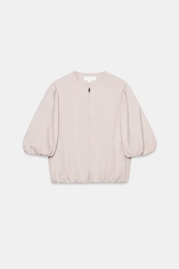Cazadora tipo bomber con cuello redondo y manga abullonada por debajo del codo, una silueta actualizada que suaviza el aire deportivo con un acabado más sofisticado. Incluye bolsillos de vivo en el delantero y bajo tipo globo con elástico, que aporta volumen controlado y un toque contemporáneo. Una prenda versátil de entretiempo, ideal para llevar con vaqueros, capri o cualquier tipo de pantalón, elevando looks cotidianos con facilidad.