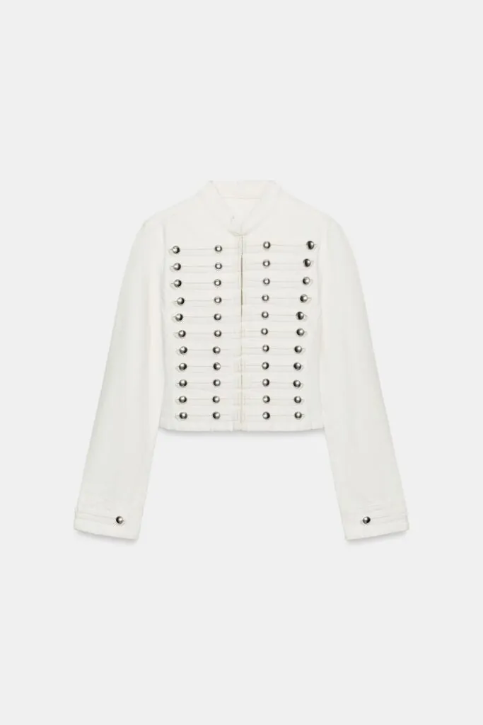Chaqueta de cuello redondo y manga larga, con una construcción cuidada en la que destacan los botones y las aplicaciones en el mismo tejido en el delantero, aportando textura y carácter sin excesos. Incorpora cierre frontal con ganchos metálicos, un acabado discreto pero con intención que refuerza su aire sofisticado. Una prenda con presencia propia, pensada para convertirse en protagonista de cualquier look y funcionar como ese comodín elegante con el que es difícil fallar.