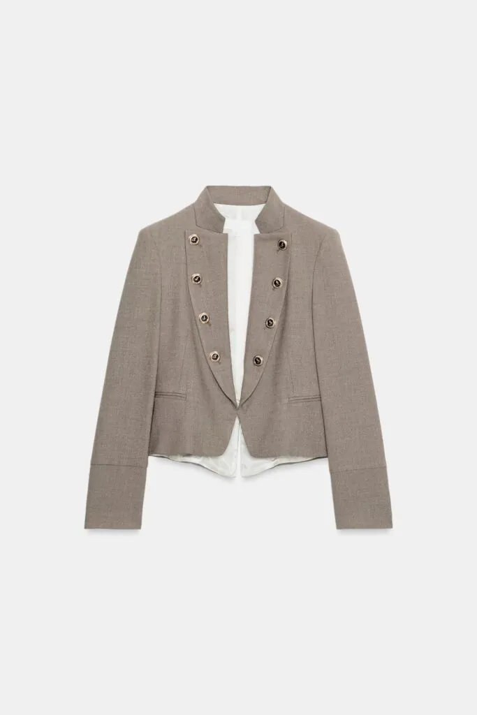 Chaqueta entallada confeccionada en mezcla de ramio que redefine la silueta con un aire estructurado y ligero. Presenta cuello subido y manga larga, junto a bolsillos de vivo en el delantero que aportan funcionalidad sin romper la limpieza del diseño. El cierre frontal cruzado con botones refuerza su carácter sofisticado, mientras el forro interior a tono completa un acabado cuidado y coherente.