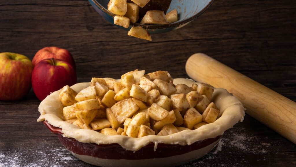 El batido de estos ingredientes se vierte sobre las manzanas en el molde y se hornea, obteniendo una tarta dorada, aromática y ligera.