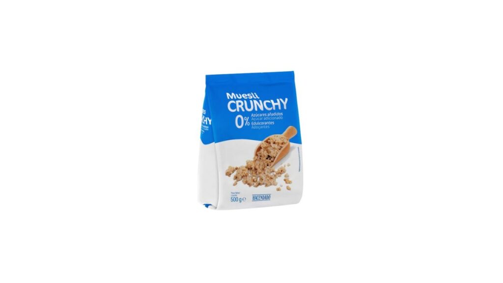 Por dar un resumen de todos los mueslis, la recomendación de Yeray es el de Muesli Crunchy 0% de azúcares añadidos. Obviamente tiene un porcentaje muy bajo de azúcar con solo 3,2 gramos por cada 100 de producto y entre sus ingredientes también están esos 23 gramos de fibra y 8’8 de proteínas.