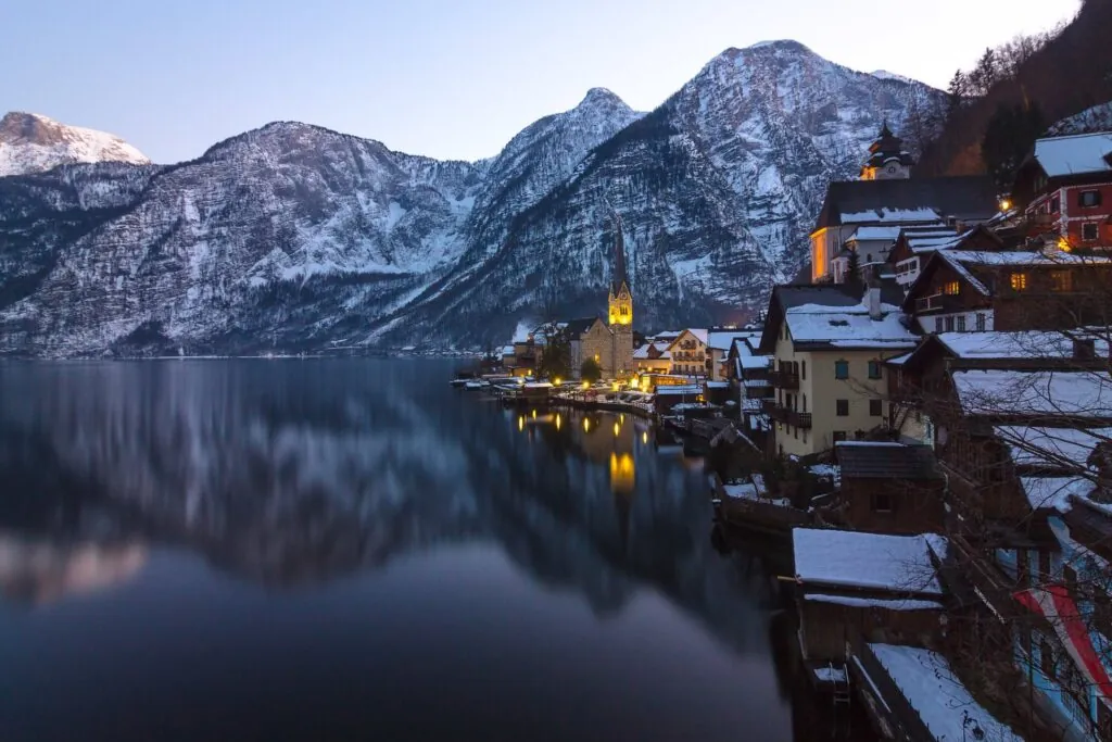1. Casitas de colores junto al lago: recorre las pintorescas casas de madera de colores pastel que bordean el lago Hallstätter See, el escenario perfecto para fotos y paseos relajantes. La combinación del agua cristalina y las montañas de fondo crea un ambiente mágico, especialmente en Navidad.