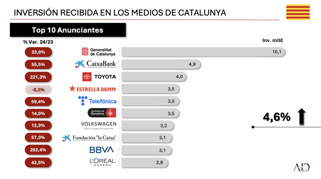 Estos datos contrastan con el desembolso de los principales anunciantes privados. Por detrás de la Generalitat, en 2024 se ubicó Caixabank como el mayor anunciante privado (con 4,9 millones). Le siguieron Toyota (4 millones); Estrella Damm y Telefónica (3,5 millones cada una). En sexta posición, se vuelve a situar una Administración pública como principal anunciante: el Ayuntamiento de Barcelona (3,5 millones), gobernado por los socialistas. Finalizan la lista de los diez principales anunciantes Volkswagen (3,2 millones), Fundación La Caixa (3,1 millones), BBVA (3,1 millones) y L’Oréal España (2,9 millones). En total, la inversión en publicidad es un 4,6% mayor que el ejercicio anterior.