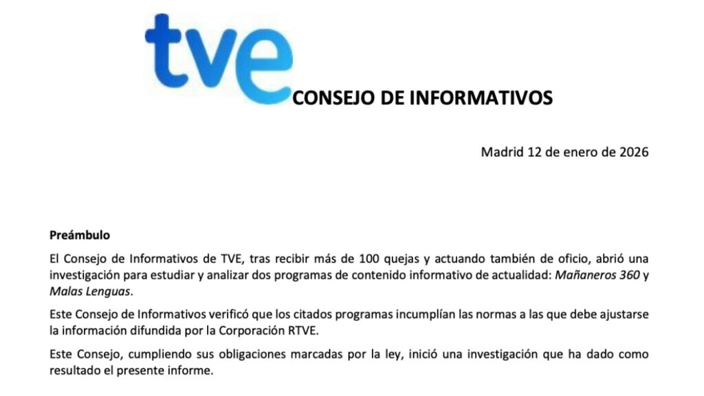 El Consejo de Informativos (CdI) de TVE ha emitido un informe, fechado el 12 de enero de 2026, en el que expone los resultados de una investigación iniciada de oficio y tras la recepción de más de 100 quejas sobre los programas Mañaneros 360 y Malas lenguas presentados por Javier Ruiz y Jesús Cintora, respectivamente. El documento, remitido a los órganos de dirección, analiza el contenido de estos espacios de actualidad y concluye que en ellos se incumplen normas fundamentales para la elaboración de información en la radiotelevisión pública.