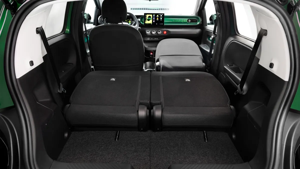 La forma de la carrocería es casi un calco del original, pero adaptada a los cánones actuales. Mide 3,79 metros de largo, lo justo para un garaje subterráneo y lo mínimo para caber en una plaza pequeña. Los retrovisores se pliegan, las manetas son clásicas y las ventanillas traseras no se bajan: se abaten, como antes. El puerto de carga se esconde en la aleta delantera derecha, y detrás hay espacio para un maletero de 305 litros, que puede escalar hasta 1.000 con las banquetas traseras replegadas. Una de las claves del Twingo siempre fue su capacidad para adaptarse, y aquí lo vuelve a conseguir.