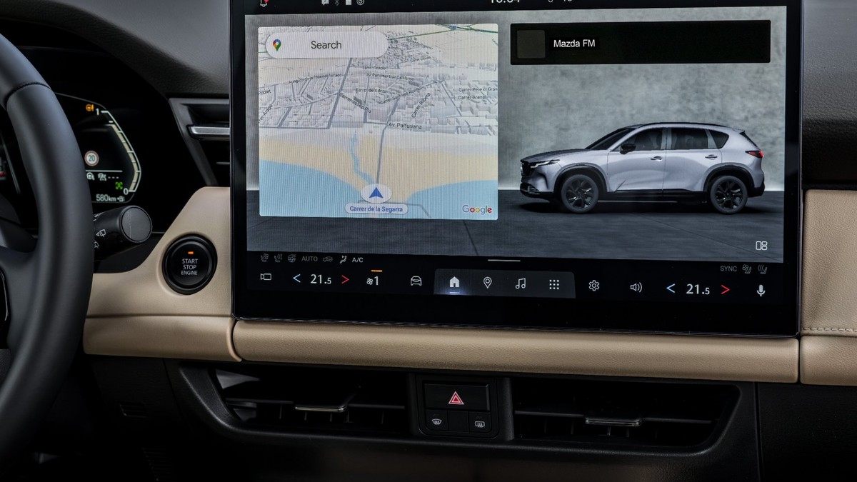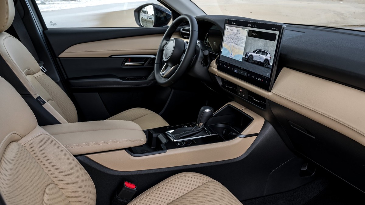 La calidad percibida sigue siendo uno de los argumentos del modelo. Mazda combina tapicerías en tela, cuero sintético o cuero auténtico según acabado. Donde sí ha habido cambios es en el plano tecnológico, que ha traído un cambio de filosofía y se nos ha teslificado. Los mandos físicos casi han desaparecido, el minimalismo digital manda, y el epicentro es una pantalla que, en su versión superior, alcanza las 15,6 pulgadas. En los acabados intermedios se queda en 12,9, que tampoco es pequeña.