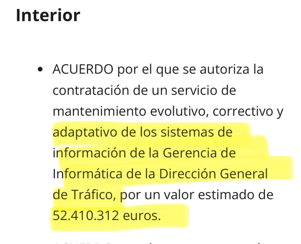 -Dirección General de Tráfico. Tenga que ver o no con las polémicas balizas, este martes el Consejo de Ministros destina 52.410.312 euros al mantenimiento evolutivo, correctivo y adaptativo de los sistemas de información de la Gerencia de informática de la DGT.
