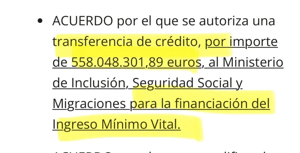-Más dinero para el ingreso mínimo vital. Más de 558 millones de euros se transfieren al Ministerio de Seguridad social para financiar esta limosna de la que el Gobierno presume como gran éxito de gestión.
