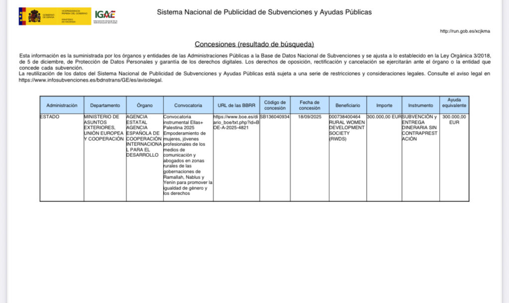 Lean: «Convocatoria Instrumental Ellas+ Palestina 2025. Empoderamiento de mujeres, jóvenes profesionales de los medios de comunicación y abogados en zonas rurales de las gobernaciones de Ramalah, Nablús y Yenin para promover la igualdad de género y los derechos».