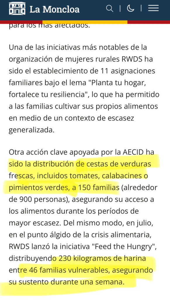 Cuando buscamos publicaciones oficiales del Ministerio de Asuntos Exteriores, Unión Europea y Cooperación español, encontramos alguna alusión a proyectos que tienen que ver con la ONG mencionada. Concretamente una publicación de la web de Moncloa que alude a esta organización en términos curiosos. En la publicación se alude a una iniciativa «muy importante» de esta misma ONG. Esta iniciativa parece consistir en 11 —sí, 11— asignaciones familiares de lo que parecen ser semillas para cultivar sus propios alimentos. El megaproyecto (léase la ironía), se llama «Planta tu hogar, fortalece tu resiliencia». ¿En esto se nos han ido 770.000 euros?