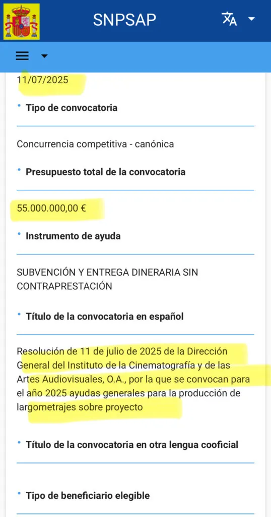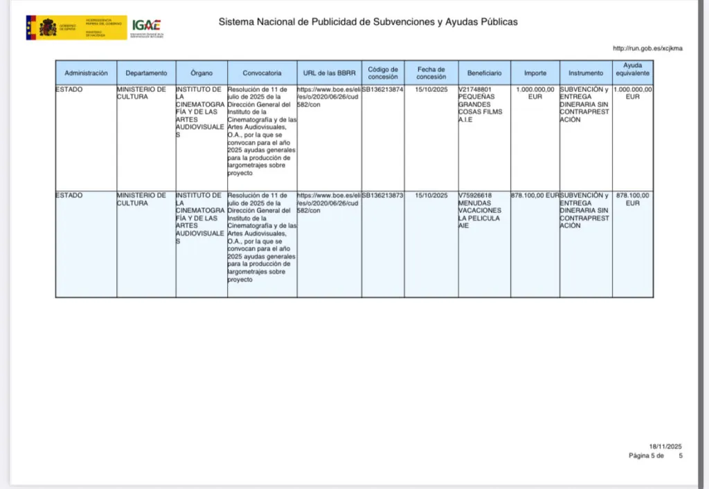 En julio de este año, el Ministerio de Cultura convocó, en virtud de la «Resolución de 11 de julio de 2025 de la Dirección General del Instituto de la Cinematografía y de las Artes Audiovisuales OA, ayudas generales para la producción de largometrajes sobre proyecto». El órgano encargado es el Instituto de la Cinematografía y las Artes Audiovisuales, y la cuantía de esta ayuda es de 55 millones de euros. El dinero se otorgó a diversas productoras e incluso a determinados largometrajes que podrán reconocer fácilmente. En lo que va de 2025, este ente ha resuelto otorgar más de 70 millones de euros.