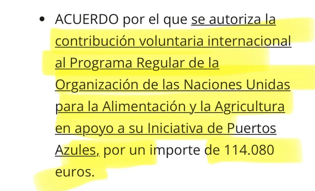 -Dinero público a entes de Naciones Unidas. Es otro habitual de cada martes la inclusión de ayudas a entes de la ONU. Ayer les tocó a la Organización de Naciones Unidas para la Alimentación y la Agricultura para «puertos azules» (114.080 euros) y a la Oficina para la Juventud (35.000 euros) Desconozco su utilidad.