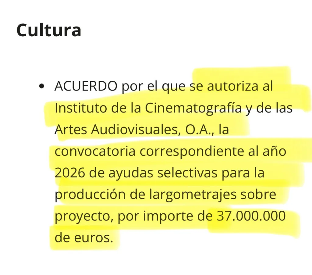 -Más ayuda al cine. A los más de 70 millones de euros que ya se habían destinado a la ayuda al cine (publicados la semana pasada en este medio) hay que sumar 37 millones de euros en ayudas a largometrajes que el Instituto de la Cinematografía y de las Artes Audiovisuales O.A. convoca para 2026. El dinero público destinado al sector del cine no deja de crecer.