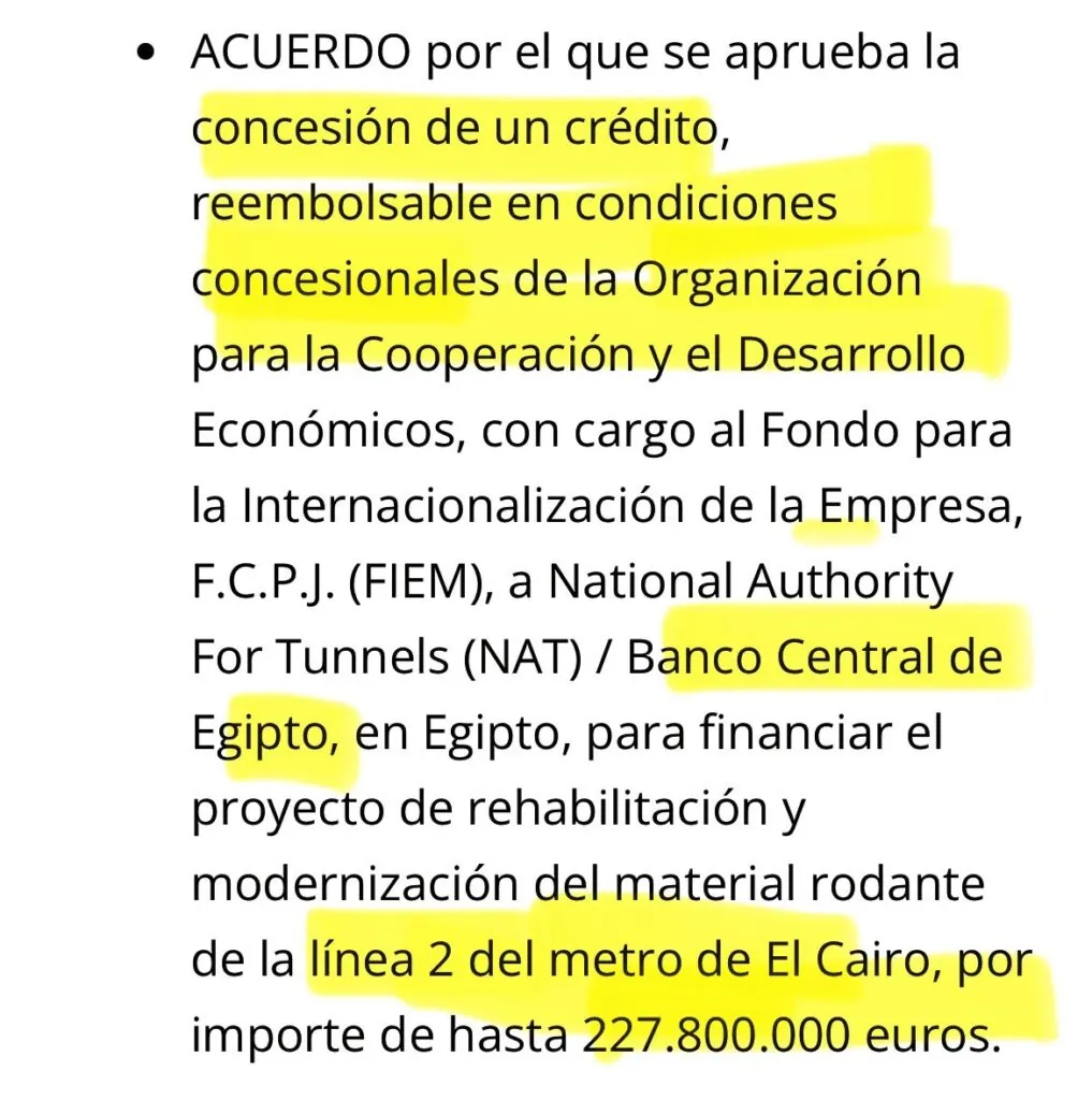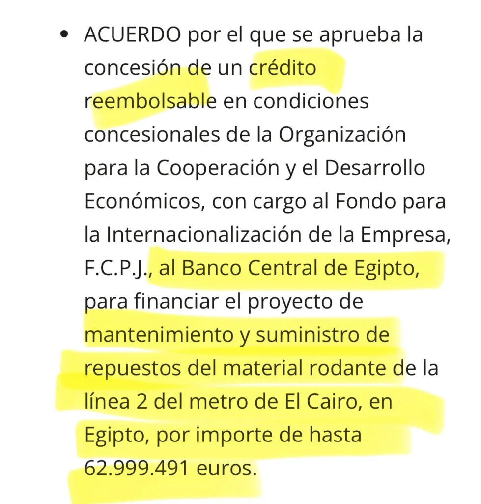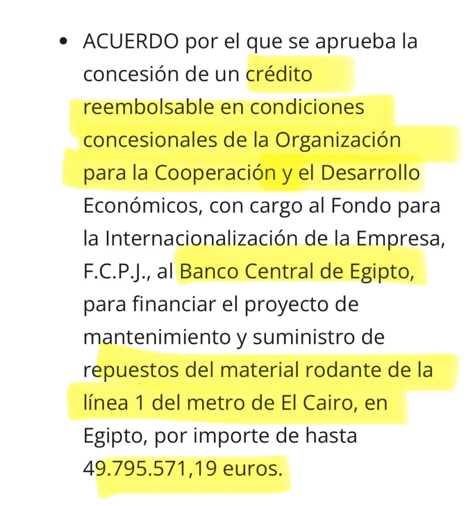 -Regalos internacionales. Este martes fue sorprendentemente alto el capítulo de cooperación internacional. En el caso de Egipto, llama poderosamente la atención que son créditos reembolsables (que nadie devuelve) para sufragar los costes derivados de las obras de la línea 2 del metro de El Cairo (al que ya hemos donado más de 387 millones de euros), y también suministros y material rodante de la línea 1. En cuanto a Costa de Marfil, las cantidades son más pequeñas y presuntamente su objetivo es formación profesional en materia de «estudios técnicos de energías renovables». En total, 228 millones para Egipto.
