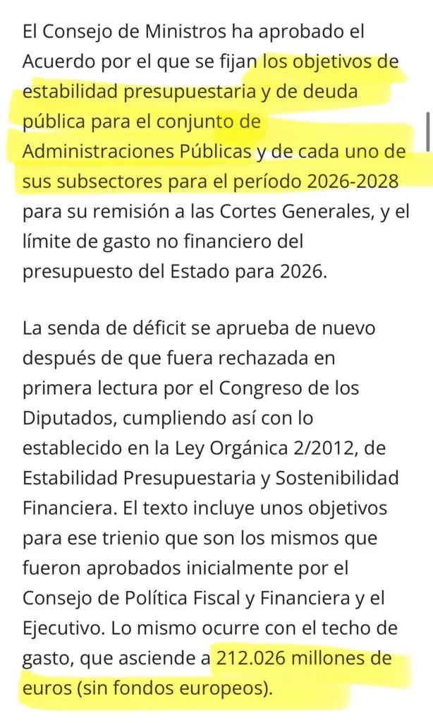 -Objetivos de estabilidad presupuestaria. El Consejo de Ministros sitúa el techo de gasto para el siguiente ejercicio en 212.026 millones de euros, sin contar con los fondos europeos. Es evidente que lo regulan en solitario y con el único apoyo de Sumar, a cambio de las sillas del consejo que ya ostentan.