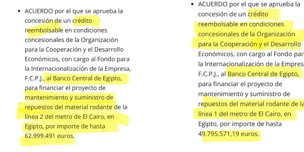 Destaco los más de 110 millones de euros destinados al Metro de El Cairo (Egipto) en créditos reembolsables. Esta partida se envió en diciembre de este año y se suma a otras anteriores que van destinadas a este menester.