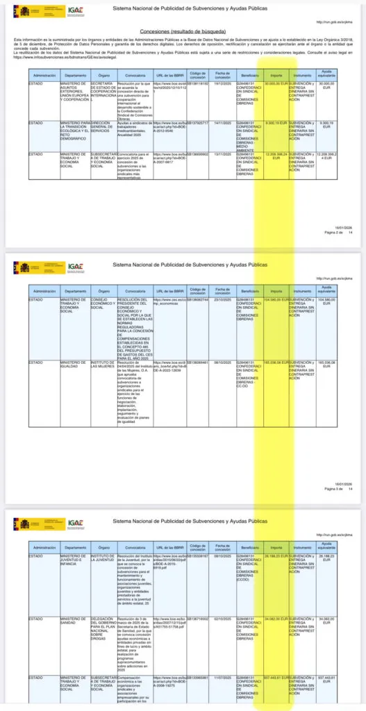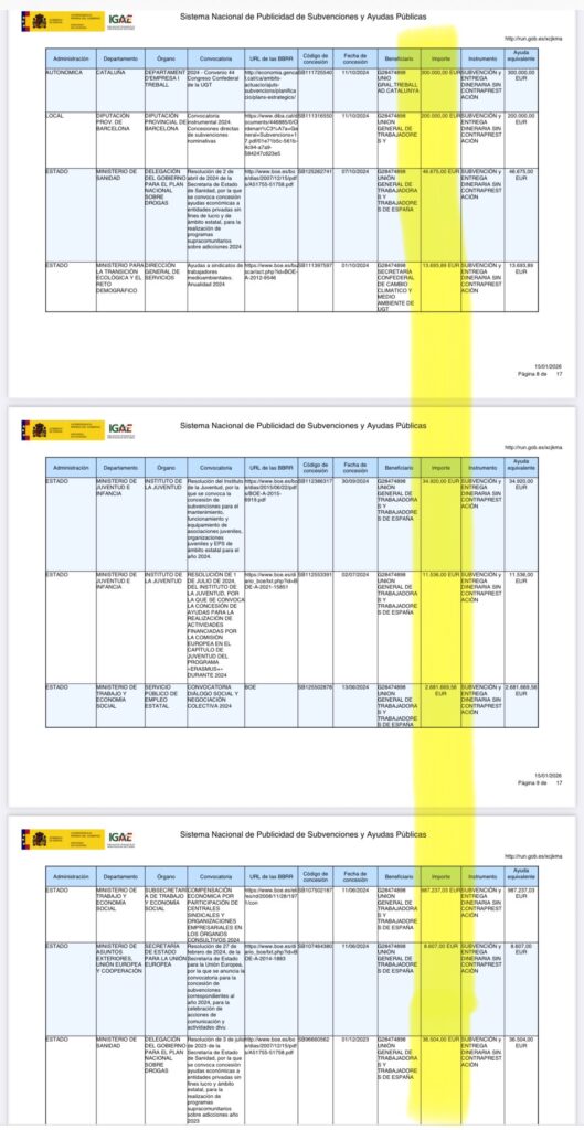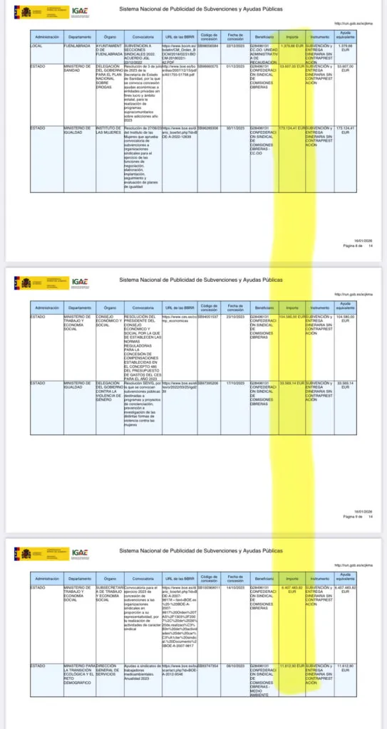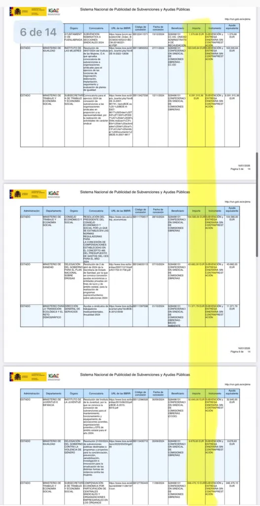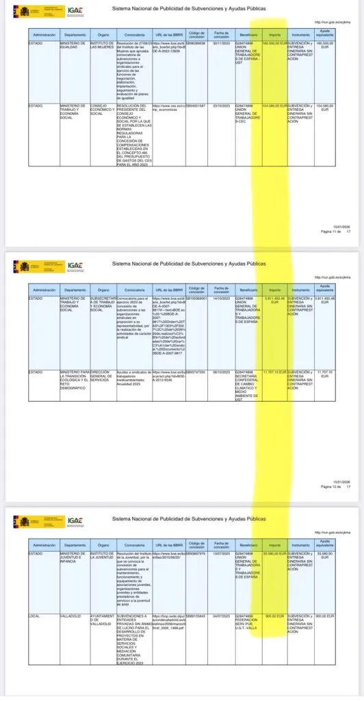 - UGT: 1.042.167 euros otorgados por el Ministerio de Trabajo de Yolanda Díaz para «compensar económicamente por su participación en los órganos consultivos. Ejercicio 2025».