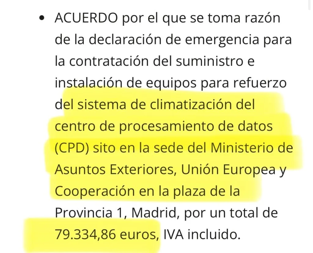 - Se declara la emergencia para el suministro e instalación de un sistema de climatización en el centro de procesamiento de datos del Ministerio de Asuntos Exteriores, Unión Europea y Cooperación. Nos va a costar 79.334 euros.