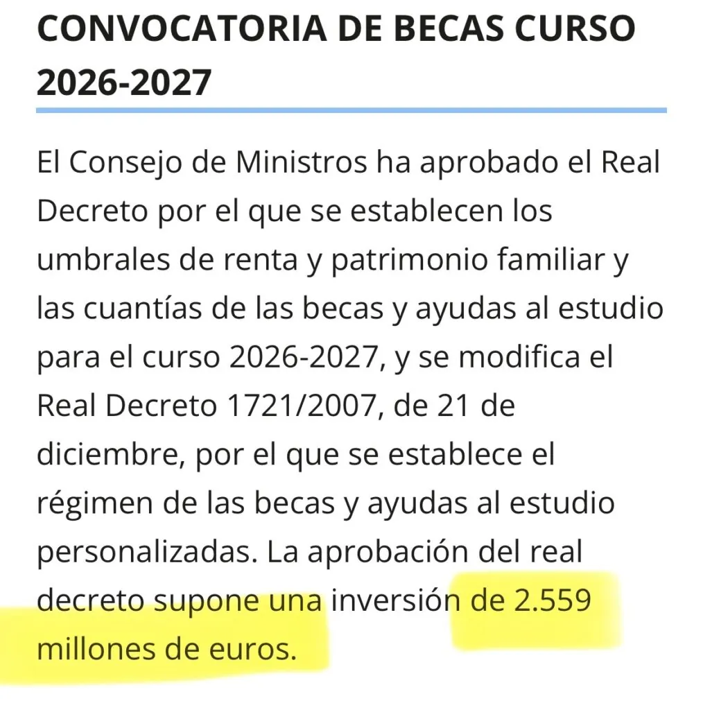 - Se convocan becas para el curso 2026-2027 por valor de 2.559 millones de euros.